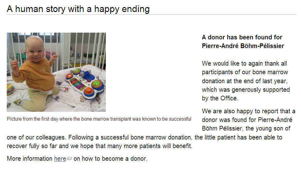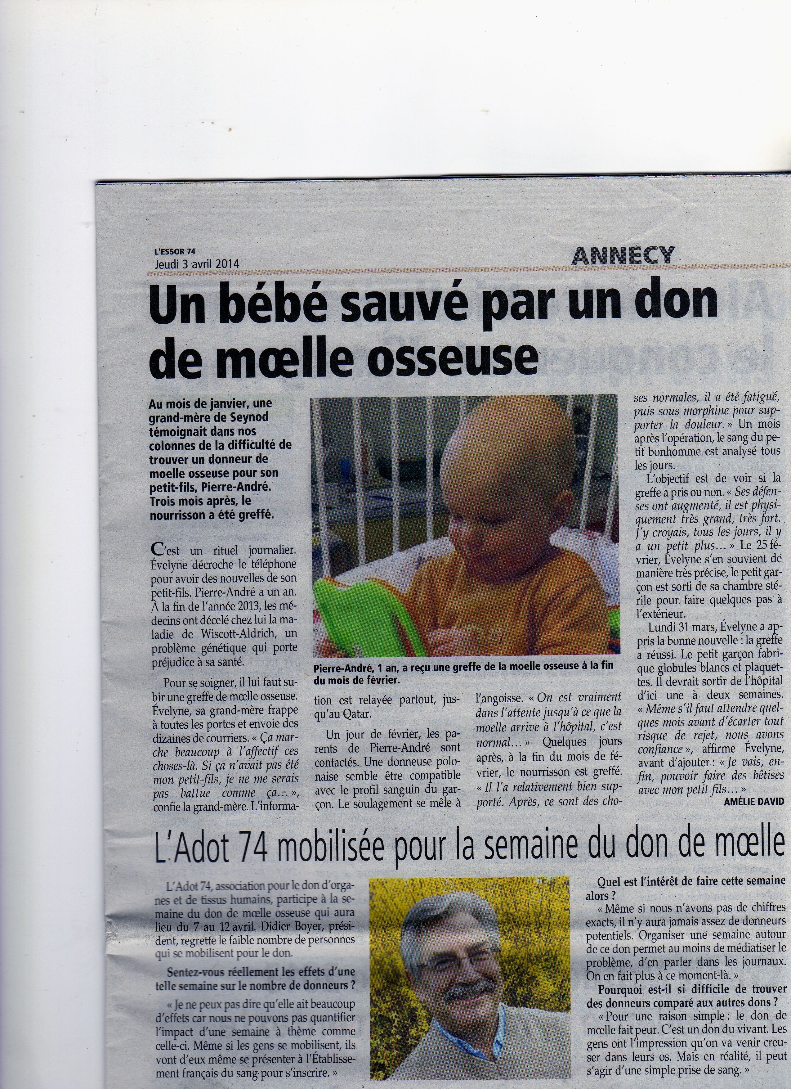 Notre fils Pierre-André (*5.2.2013) a souffert d'une maladie génétique . Par la transplantation de moelle osseuse il a été guéri. Pour devenir donneur et "veilleur de vie" : voir ici