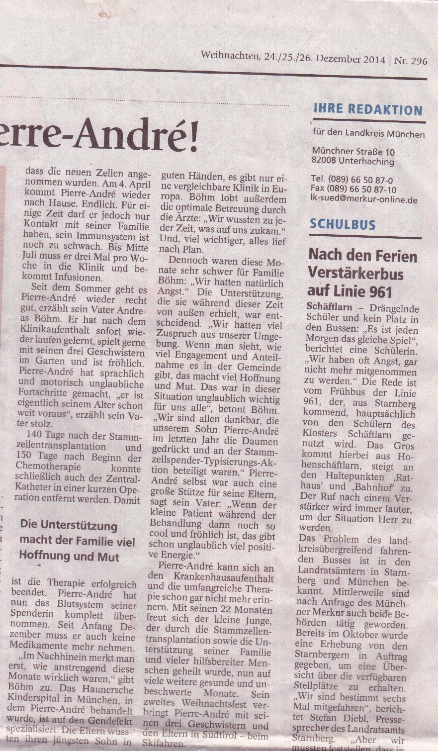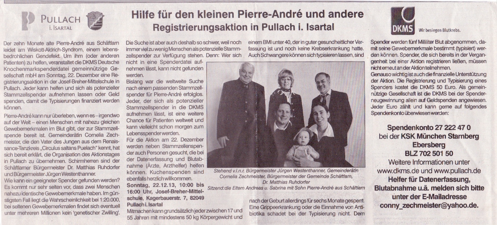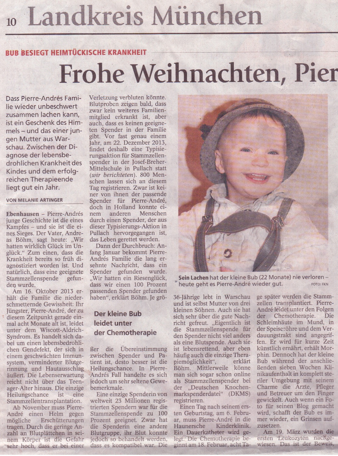 Unser Sohn Pierre-André (*5.2.2013) litt an WAS . Durch eine Stammzellen-Transplantation wurde er von dieser lebensgefährlichen Krankheit gerettet und wieder gesund. Bei der DKMS kann man sich mit einer Speichelprobe (auch von zu Hause) in die Spende-Kartei eintragen lassen und Lebensretter werden. Registrieraktion am 22.12.2013 in Pullach : siehe Presse.